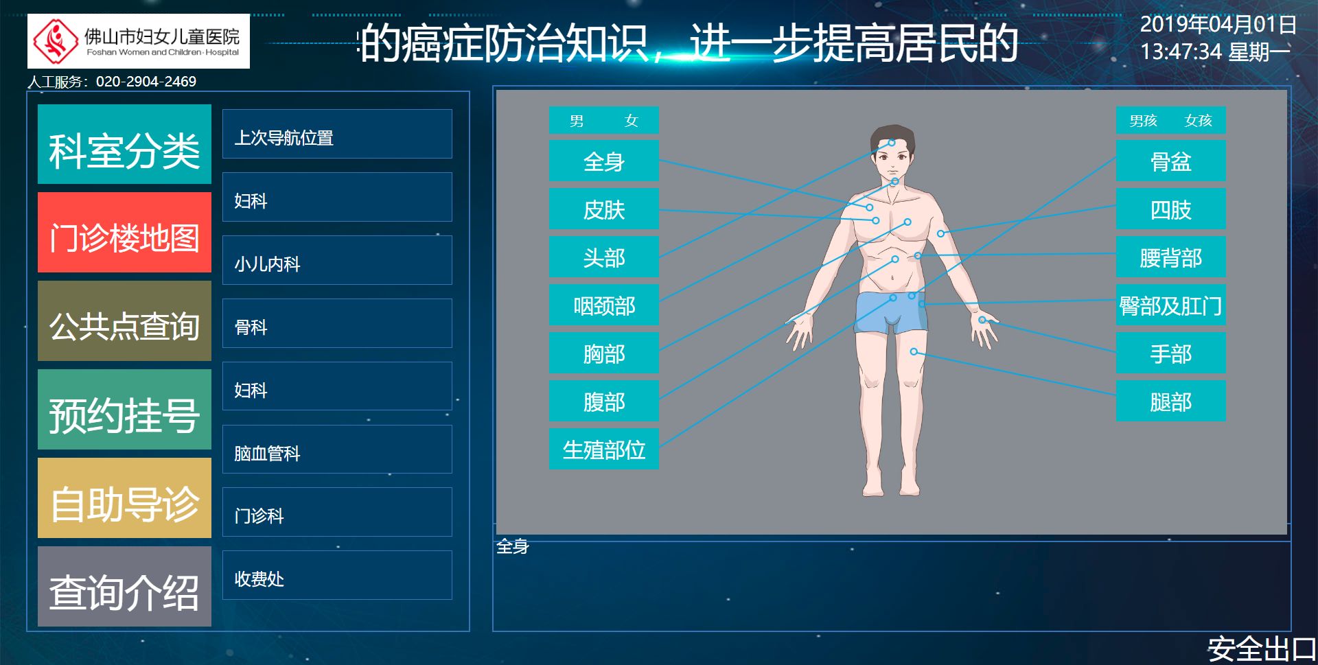 機器人通過語音提示指引患者查詢需要就診的科室,例如:患者頭痛,機器人會通語音提示患者按相應(yīng)的操作,進一步判斷需要就診的科室,并且顯示圖文介紹和語音提示。 同時彈出醫(yī)院掛號的微信二維碼,方便患者輕松掛號。