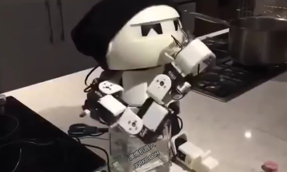 機器人右臂握住酒杯,當感覺到酒倒入后,會抬起手臂與人碰杯,再把杯子端起來緩緩喝下……