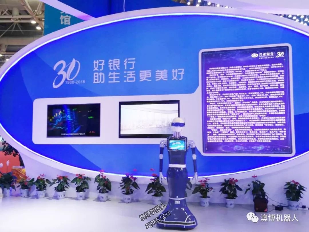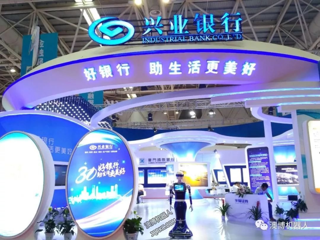 人型機器人藍豆在展會上,帶領參展觀眾全面了解興業銀行成立三十年的發展歷程,體驗該行全新的高科技金融服務產品、為在場的客人提供帶領引導,金融知識講解服務。