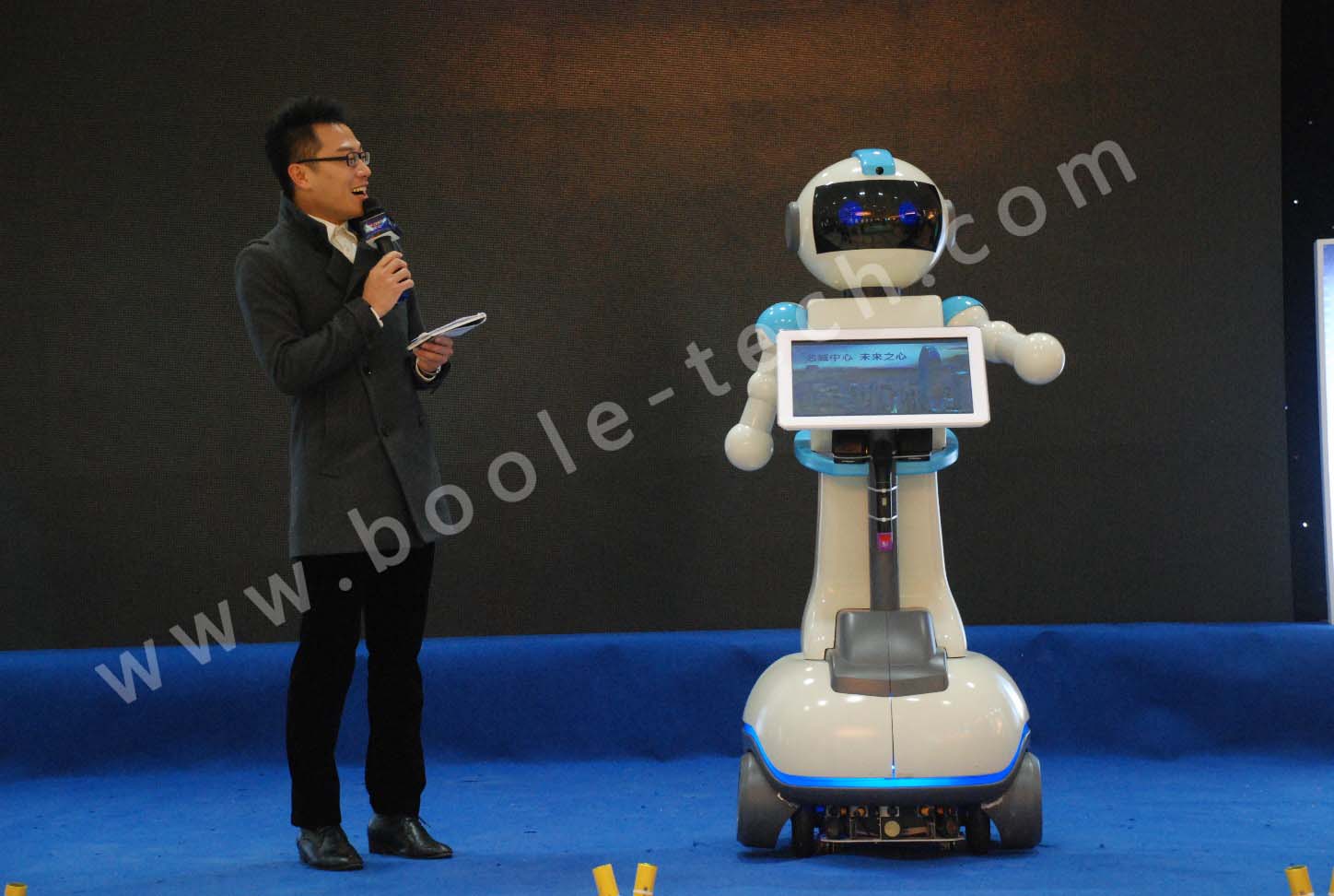 主要功能語音播報語音講解語音交互。可結(jié)合實際需要輸入需要播報、講解、交互的各種專業(yè)信息,眼睛和嘴部由LED燈組成,說話時LED等會亮亮起,配合語音內(nèi)容做出各種表情,可愛活潑,惹人喜愛,胸前液晶顯示屏?xí)峁┎笾v解的文字內(nèi)容。