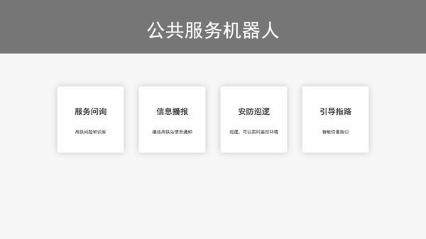 高鐵站+機器人解決方案 產(chǎn)品介紹 每當(dāng)節(jié)假日,高鐵站客流大量增加,咨詢客服人員需要排隊等候,大大降低了高鐵站的服務(wù)質(zhì)量。智能機器人可以高效完成服務(wù)問詢、位置指引,信息...